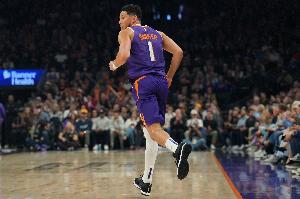 赛后,美国新星队队员、太阳球星德文·布克参加了新闻发布会。