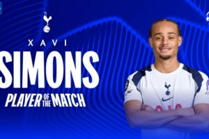 梅开二度,欧冠官方:哈维·西蒙斯当选热刺3-2马竞全场最佳球员