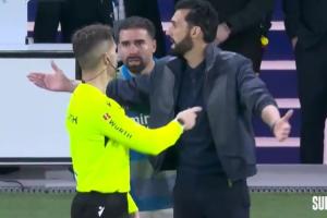 皇马球员们满脸难以置信,看台上嘘声震天,替补席上的阿韦洛亚更是毫不掩饰对裁判判罚的不满。此时,主裁判主动走向阿韦洛亚,向他解释直接出示红牌的判罚依据。