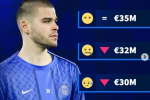 体育资讯3月25日讯 德国转会市场晒照,预热巴黎门将舍瓦利耶的身价,四种方案的三种都是身价下调。