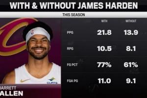 天差地别?哈登加盟前阿伦场均13.9分 哈登加盟后暴涨至21.8分!